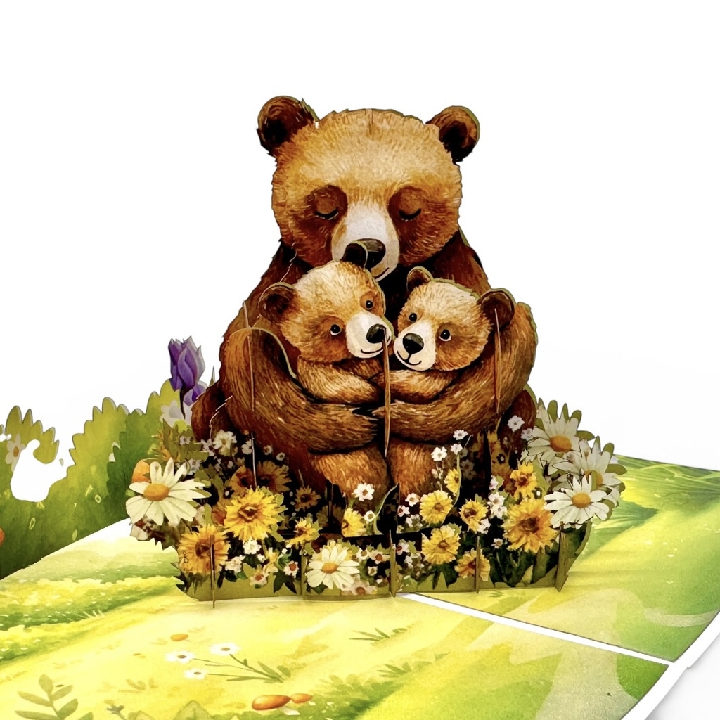 A sweet and heartwarming surprise appears when this Bear Family Pop-Up Card is opened. At the center of the design, a gentle mother bear hugs her two adorable cubs, surrounded by blooming wildflowers in a peaceful meadow. The charming 3D structure beautifully represents family love, warmth, and protection.