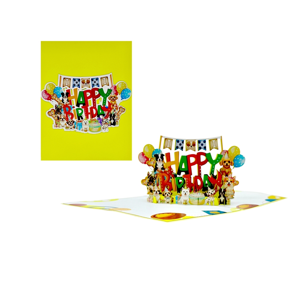 The Happy Birthday Dogs Pop-up Card is a joyful 3D birthday greeting card featuring an adorable group of dogs celebrating a birthday party. When opened, the card reveals a vibrant three-dimensional scene with colorful balloons, a birthday cake, playful puppies, and bold “Happy Birthday” lettering that instantly creates a cheerful and festive atmosphere.