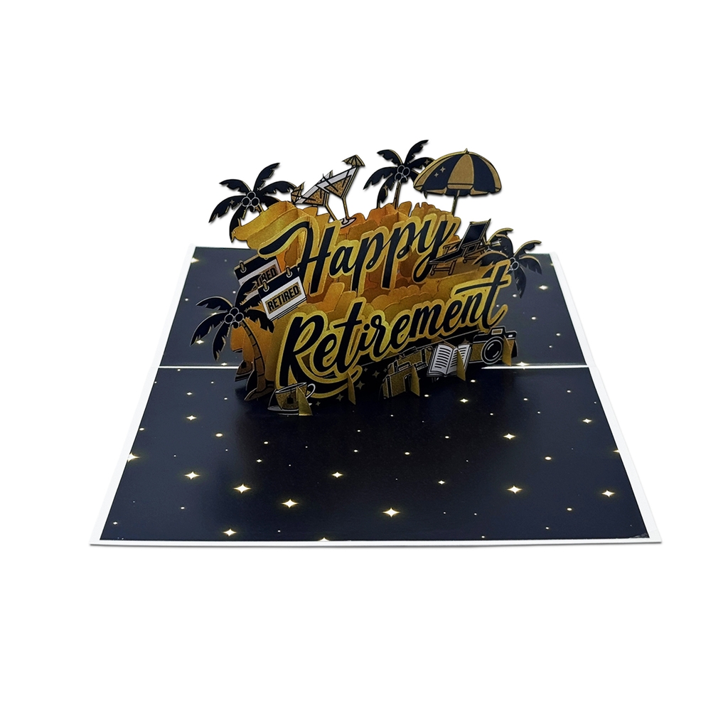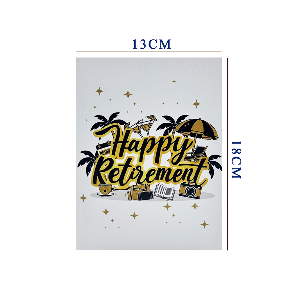 Happy Retirement Pop-up Card is a luxury laser-cut 3D greeting card handcrafted in Vietnam, designed to celebrate a meaningful milestone with joy, pride, and relaxation. The card features a stylish tropical retirement scene with palm trees, beach elements, travel icons, and the bold golden message “Happy Retirement” as the centerpiece. When the card opens, the entire three-dimensional scene rises impressively, delivering a strong visual impact and a memorable emotional experience.