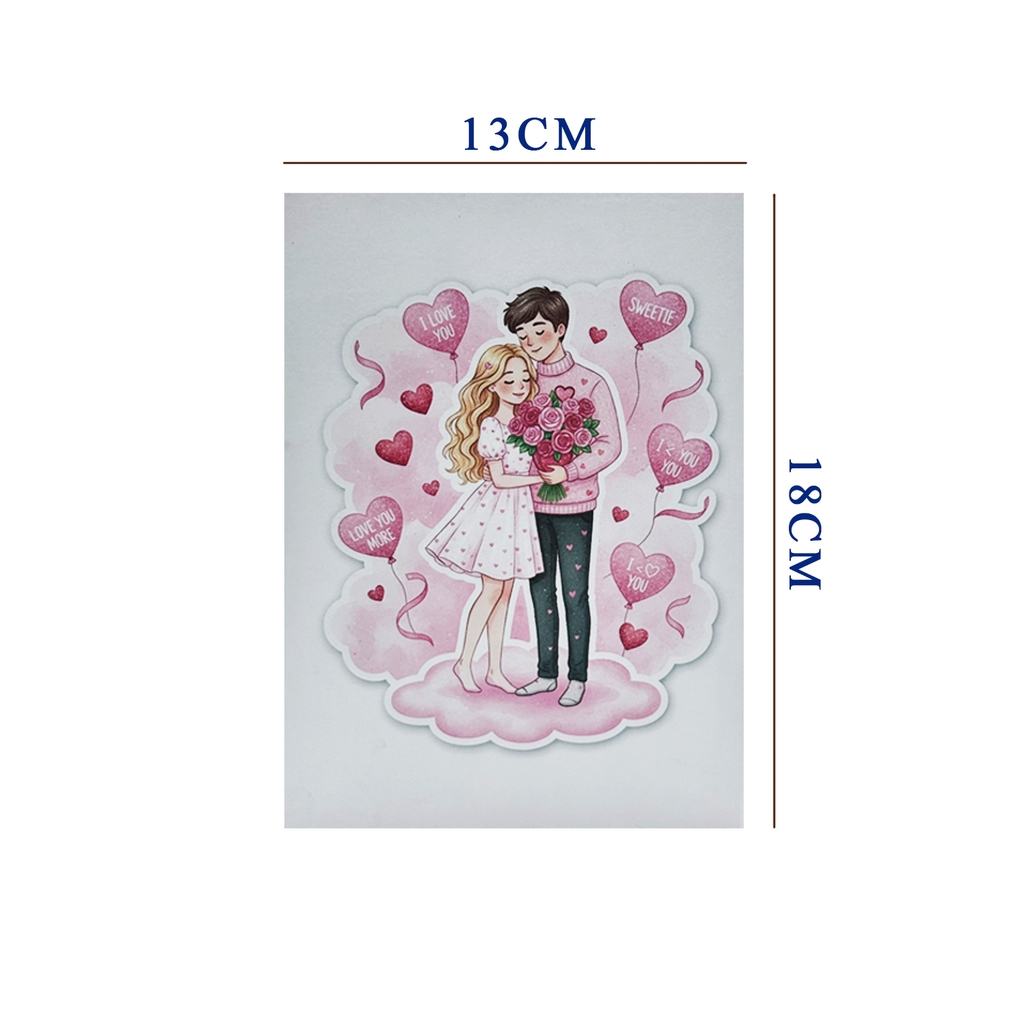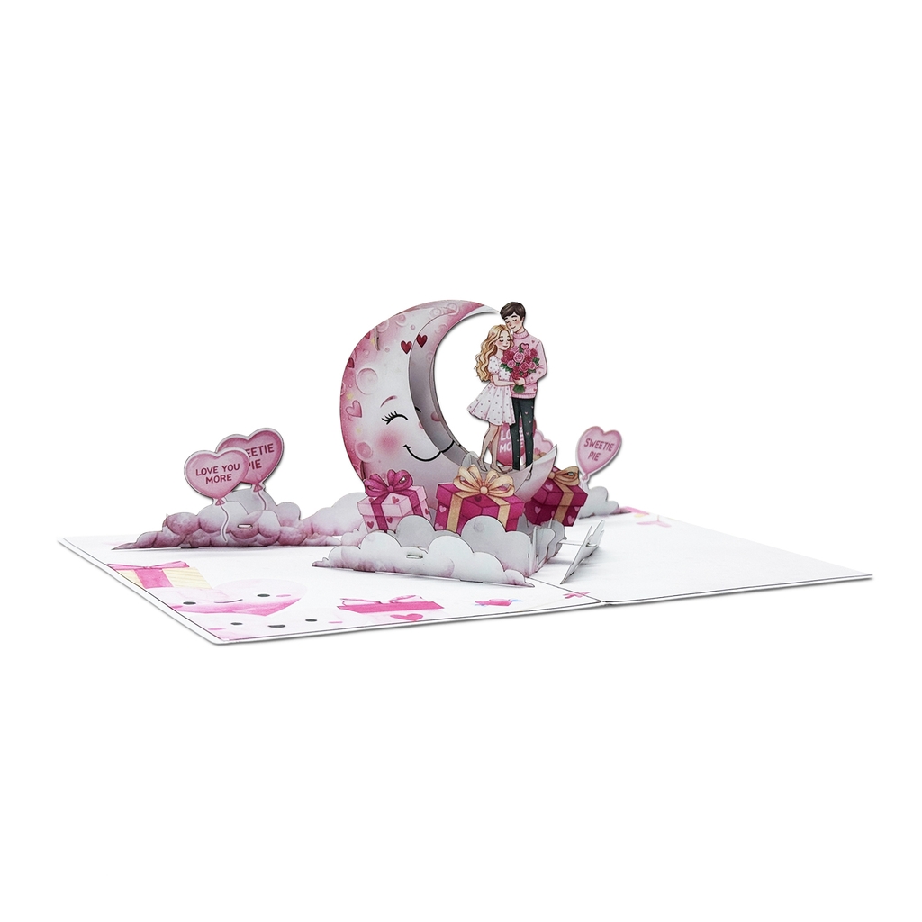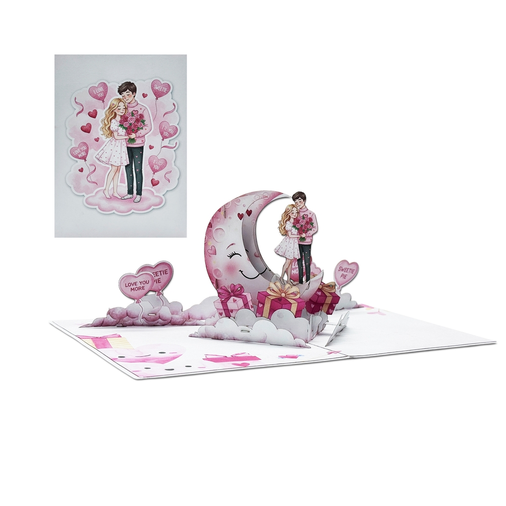Love Moon Pop-up Card is a romantic laser-cut 3D greeting card handcrafted in Vietnam, designed to celebrate love in the most sweet and emotional way. The card features a loving couple standing on a dreamy crescent moon surrounded by heart-shaped balloons, soft clouds, and gift boxes. When the card opens, the three-dimensional scene rises beautifully, creating a magical and touching moment for the recipient.