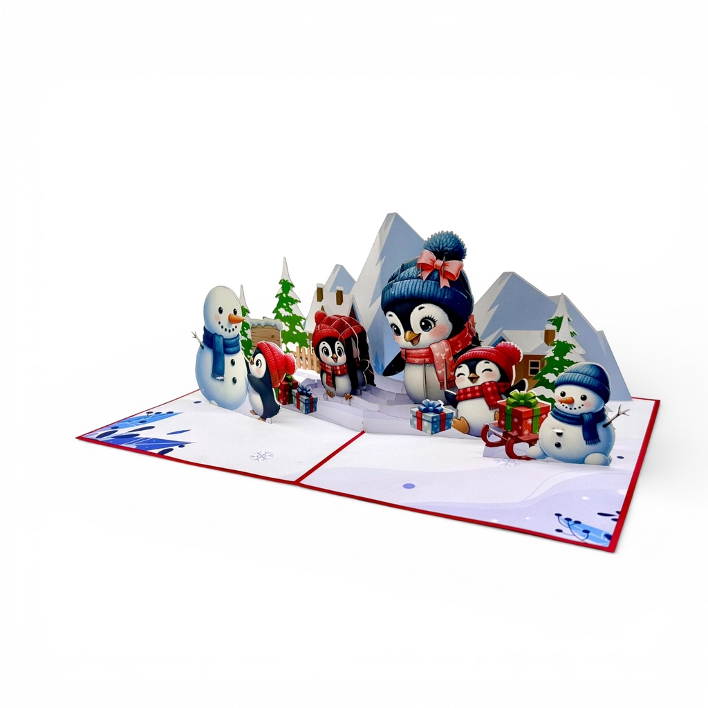 Celebrate the magic of the holiday season with the Penguin Christmas Pop-Up Card. When opened, a joyful winter scene unfolds featuring adorable penguins, a snowman, and festive decorations set against snowy mountains, bringing the cheerful spirit of Christmas to life.