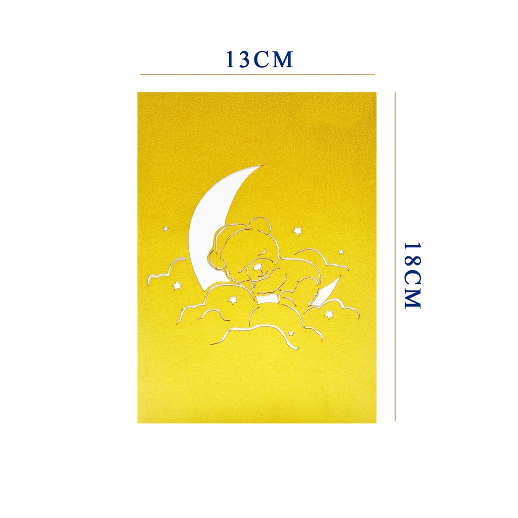 Send warm and gentle wishes with our Sleeping Teddy Bear Pop-Up Card, featuring an adorable bear peacefully resting on a crescent moon amidst soft clouds and twinkling stars. This charming 3D card is an ideal choice for baby showers, welcoming a new baby, or simply sending comforting goodnight messages.