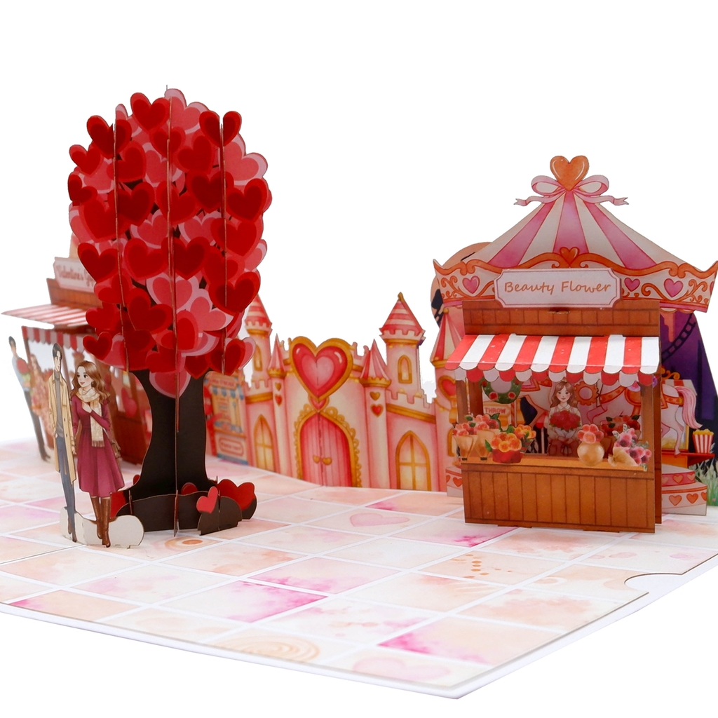 Romantic Festival Pop-up Card is a premium laser-cut 3D greeting card handmade in Vietnam, designed to capture the beauty of love, celebration, and joyful moments. The card features a romantic couple standing under a heart-shaped balloon, surrounded by colorful festival stalls and a dreamy castle backdrop. The lively market scene combined with warm lighting creates a magical atmosphere that instantly touches the recipient’s emotions as soon as the card opens.